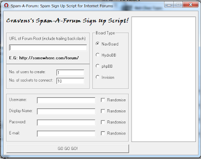 Forum Spammer Posted by Taikkyi Thar on February 20, 2013 Get link Facebook X Pinterest Email Other Apps Forum ေတြကို Spam ပစ္တဲ့ Tool ေလးပါ။NavBorad,HydroBB,phpBB,Invision စသည္ဖိုရမ္ေတြကို Spam ပစ္ႏိုင္ပါတယ္။ Download MediaFire Comments
